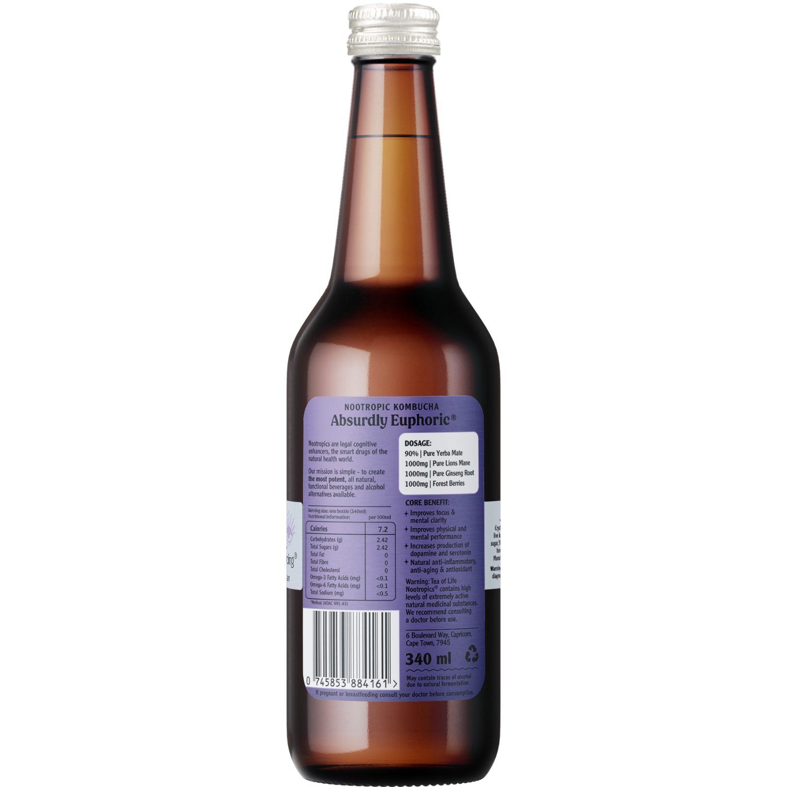 Crystal & charcoal filtered water, live kombucha cultures, natural raw sugar, Yerba Mate (90%), Lion’s Mane (1000mg), Ginseng Root (1000mg), Forest Berries (1000mg)