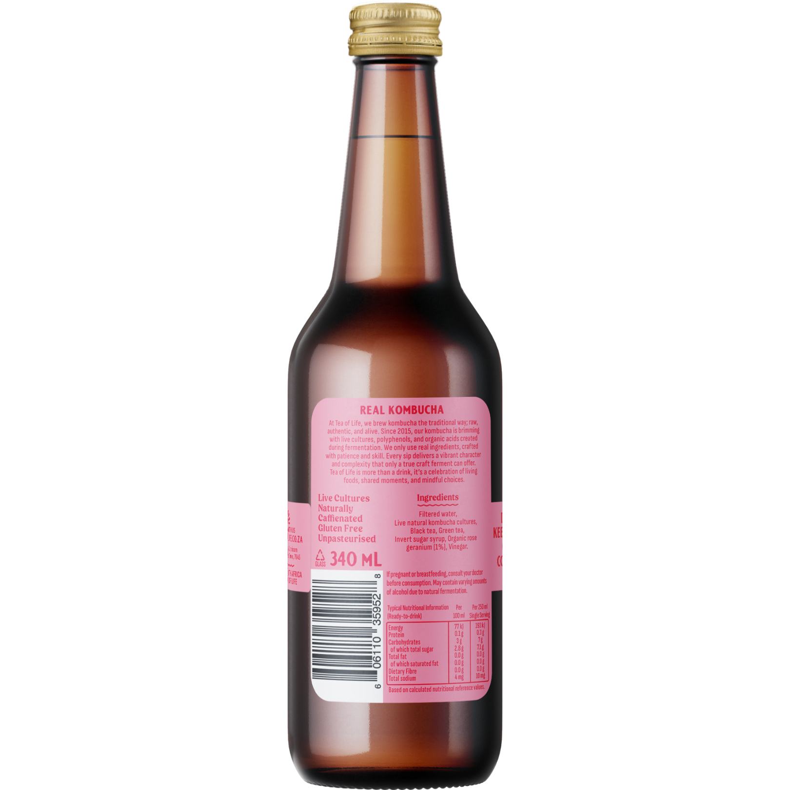 Filtered Water, Live Natural Kombucha Cultures, Black Tea, Green Tea, Invert Sugar Syrup, Organic Rose Geranium (1%), Vinegar.